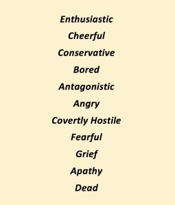 I believe that one of the great developments of the last century in the fields of human behavior, psychology, physiology, and even politics, was the discovery of something called the Emotional Tone Scale. The emotional tone scale is just that: a scale of emotions that ranges as follows, from top to bottom: